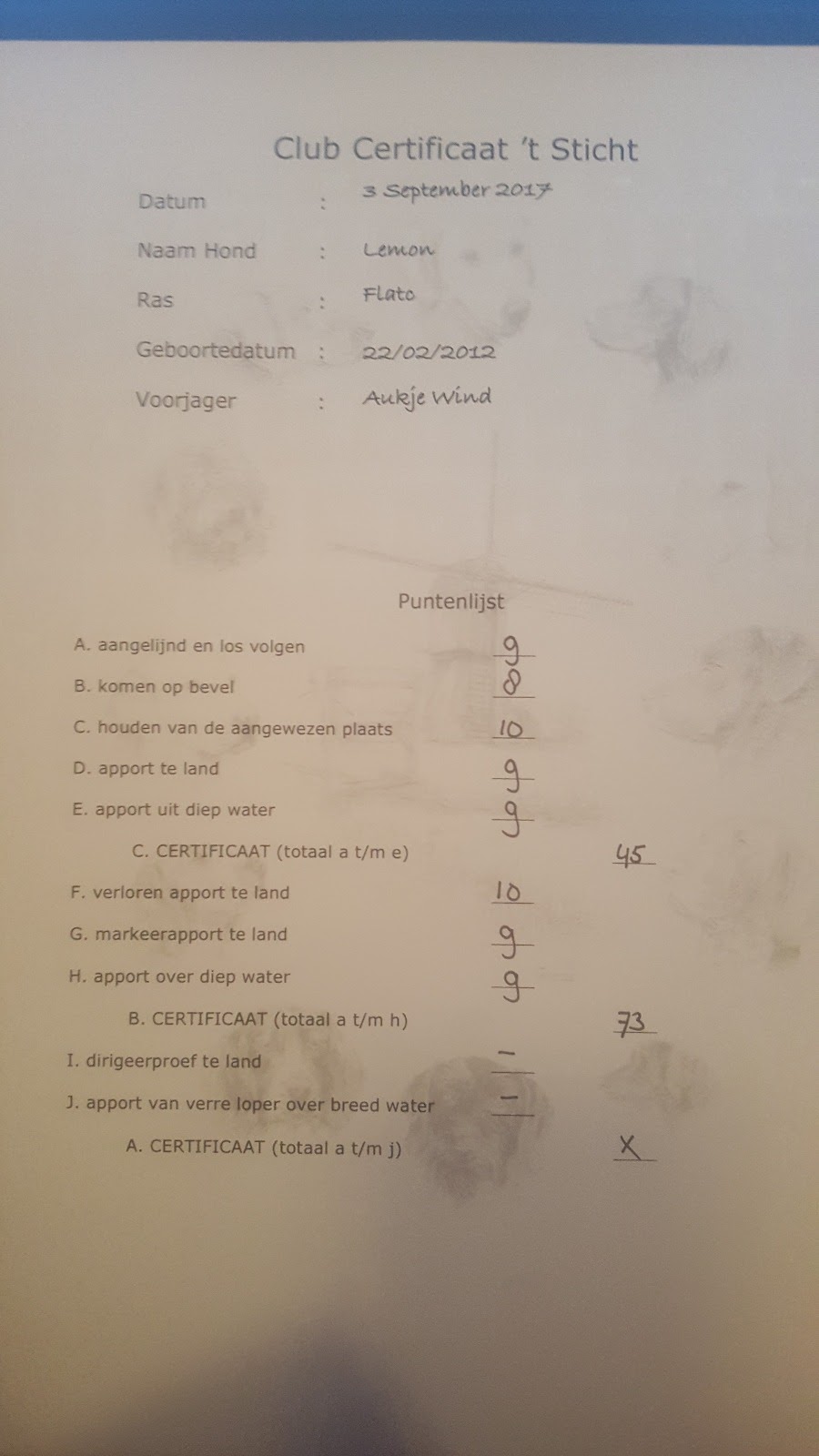 Lemon ging erg lekker, op het konijn na was ik heel tevreden. Voor het konijn had ze makkelijk een 9 kunnen halen, maar ze vond het duidelijk een vies konijn.. (1 konijn wordt voor meerder honden gebruikt en je kan zelf wel bedenken dat dat niet altijd fris meer is na een aantal honden). Ze pakte hem niet meteen op en liet hem vlak voor mn voeten vallen, ik moest haar een extra commando geven om hem weer op te pakken en in mijn handen te geven. Ook liet ik haar niet zitten dus kwamen we uit op een 6.. jammer want uiteindelijk haalde we een B met 66 punten, ik had graag 68 gehad omdat we dan mee kunnen doen aan MAP's.. maar ja, dat komt dan wel na haar nest.